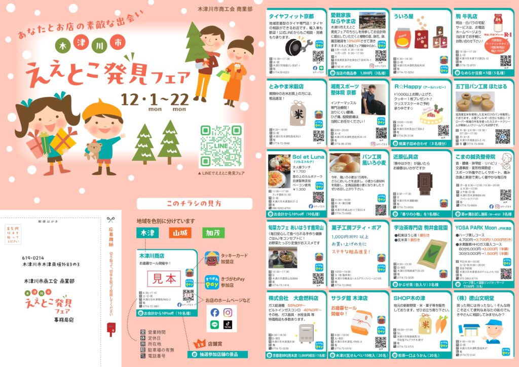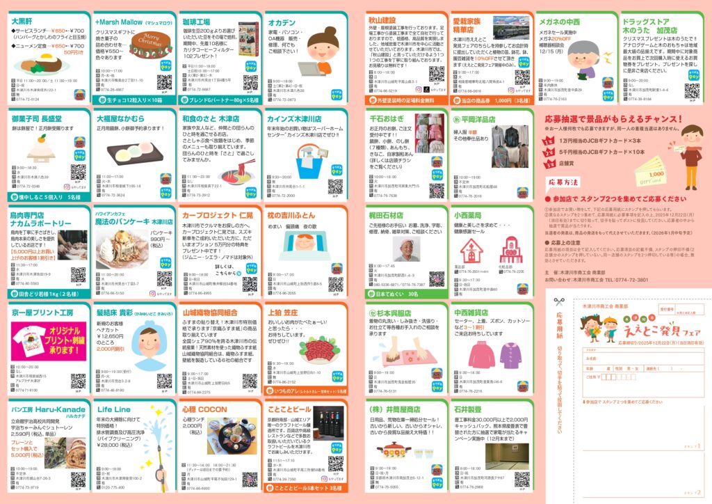あなたとお店の素敵な出会い♪~木津川市ええとこ発見フェア~ 2025 12/01 参加店で、スタンプ2つ集めれば、豪華賞品が当たるチャンス!今年はLINEで応募もできます。下記から友達登録して、スタンプカードをGETしましょう。実施期間 は、12.1~12.22まで ↓LINE木津川市商工会(まちのイチオシ紹介)友達登録へのリンク↓ https://lin.ee/LmDgOa3 お知らせ セミナー・イベント きづがわPayの繰り上げ抽選(11/11実施)について 木津川市商工会のホームページがリニューアルしました!